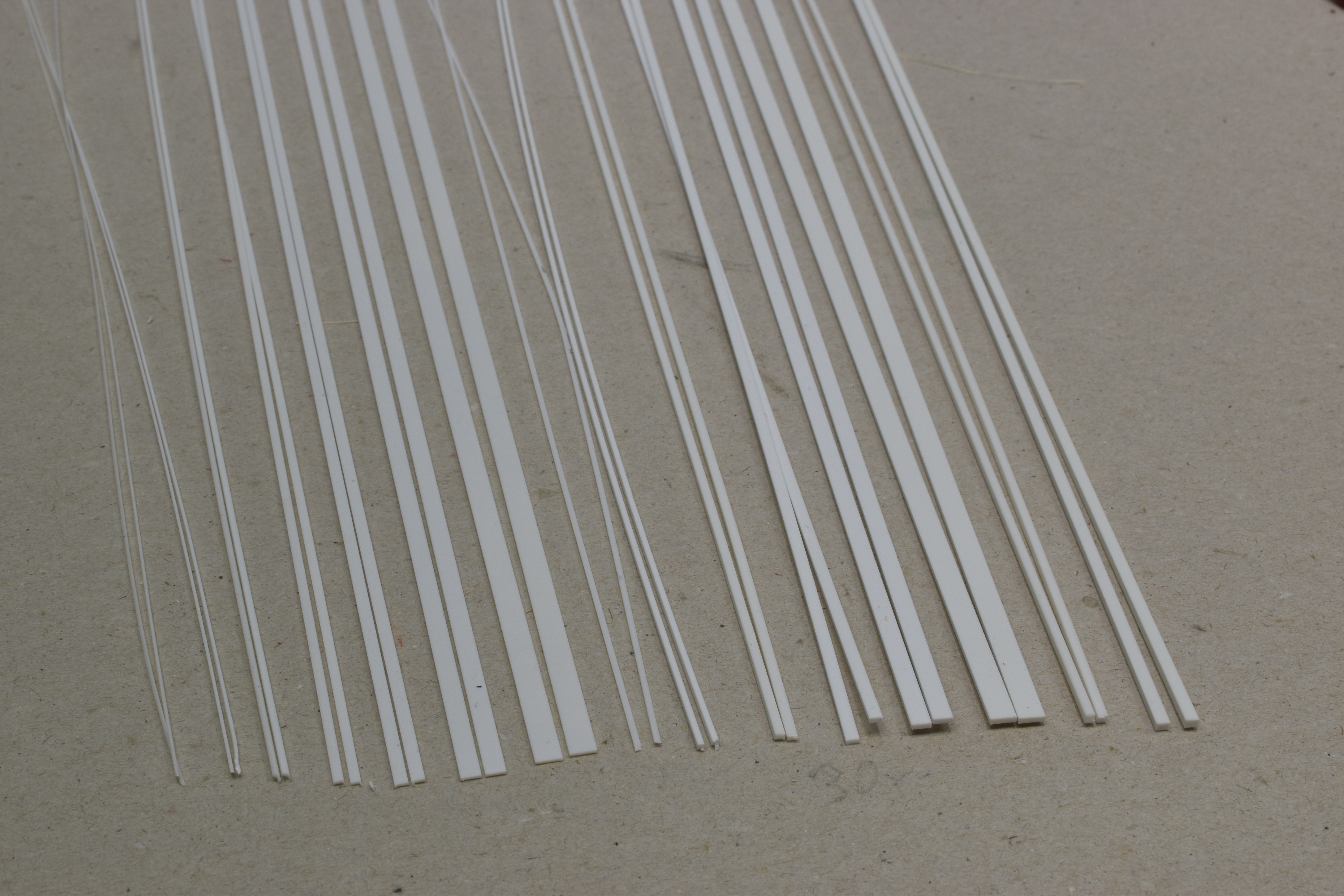 30 Streifen aus durchgefärbtem weissem Polystyrol gefräst.