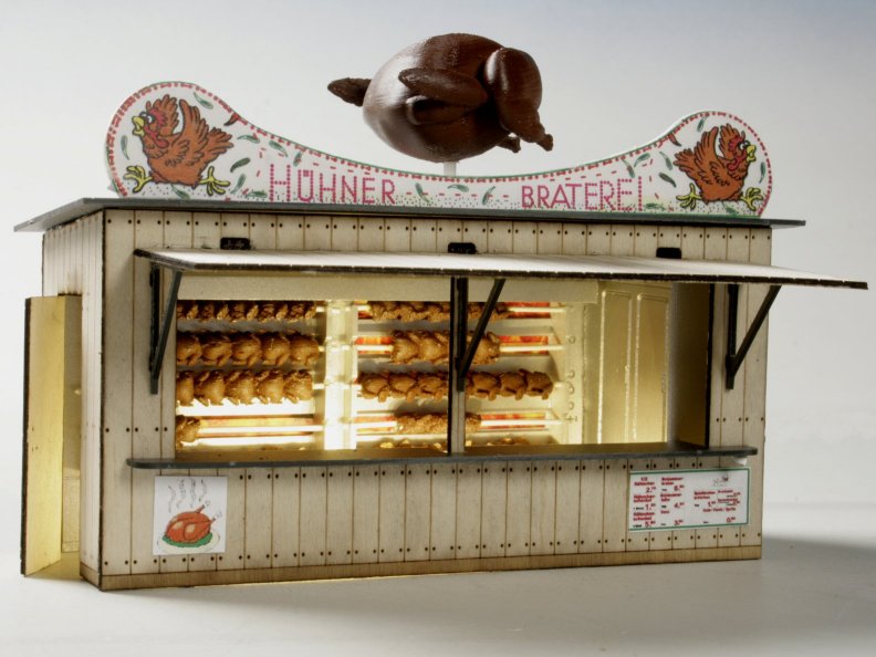 Die Bude hat eine Stellage mit 39 Grillhähnchen auf 8 Spiessen,