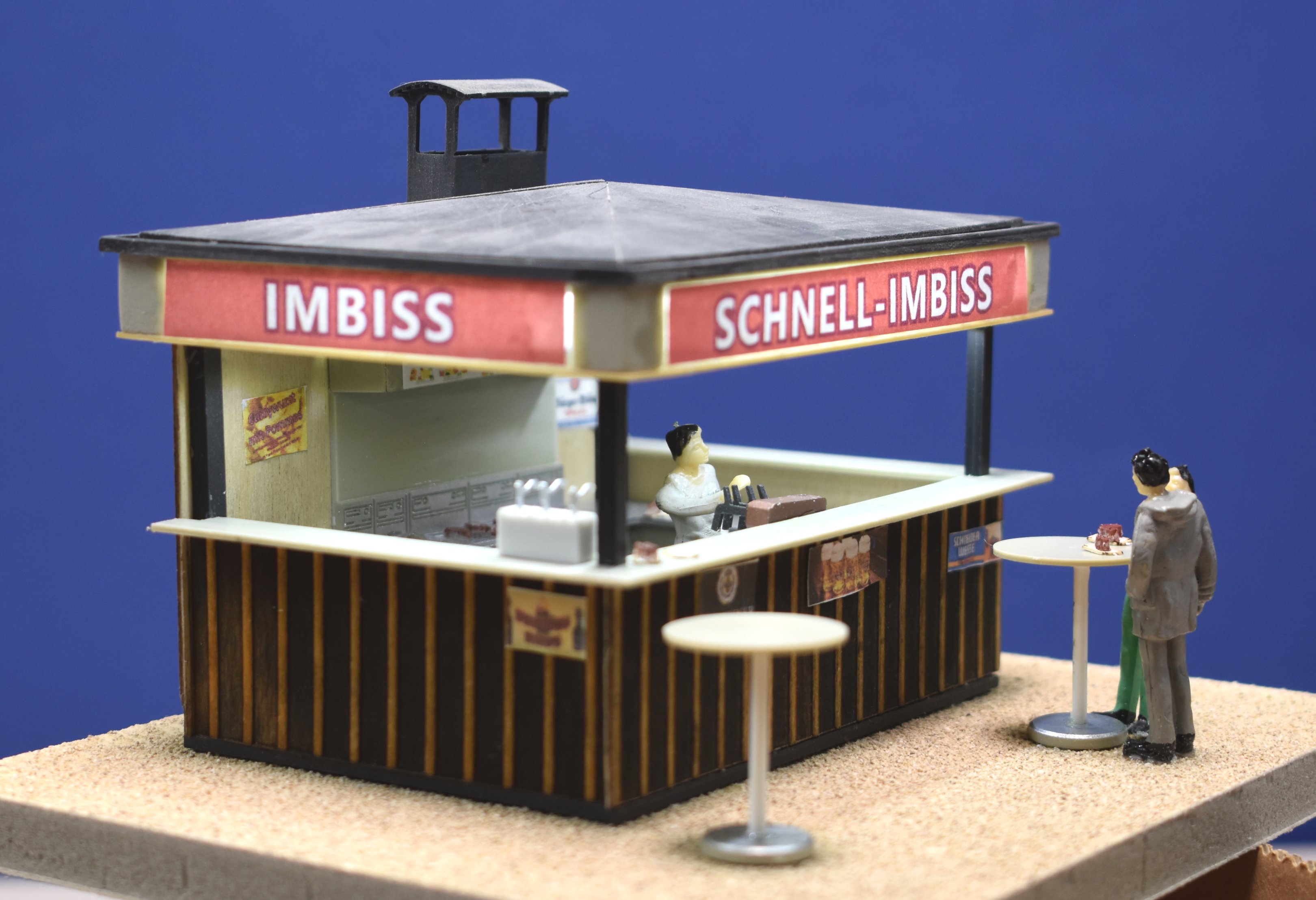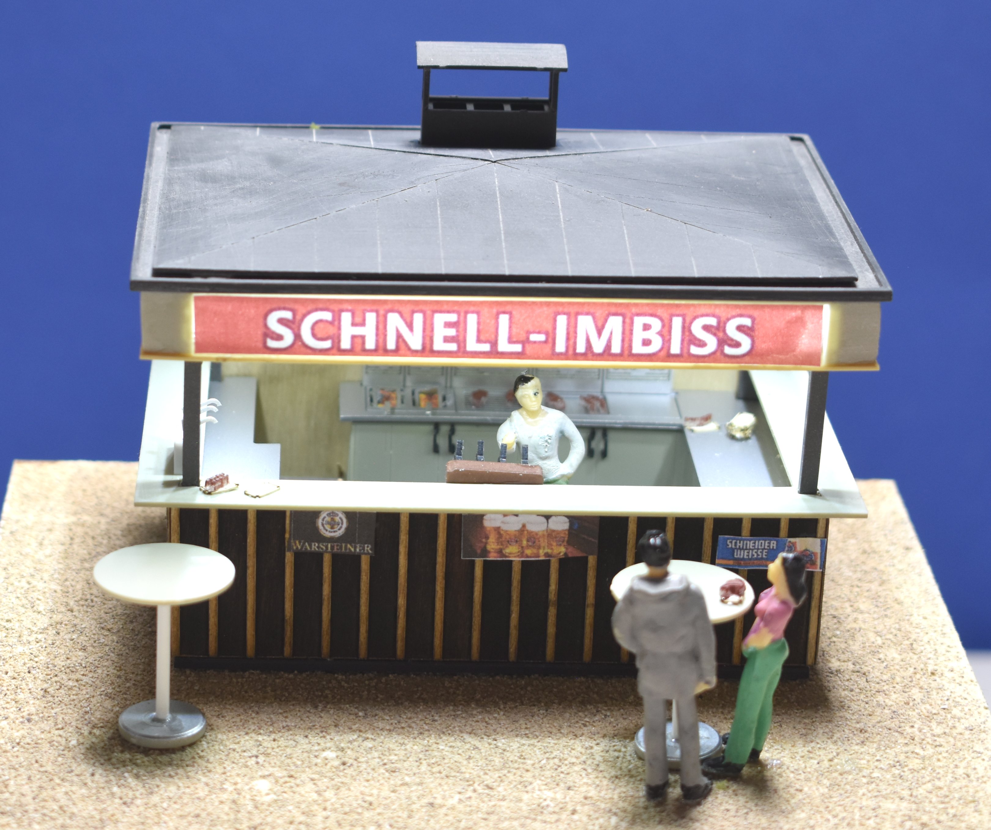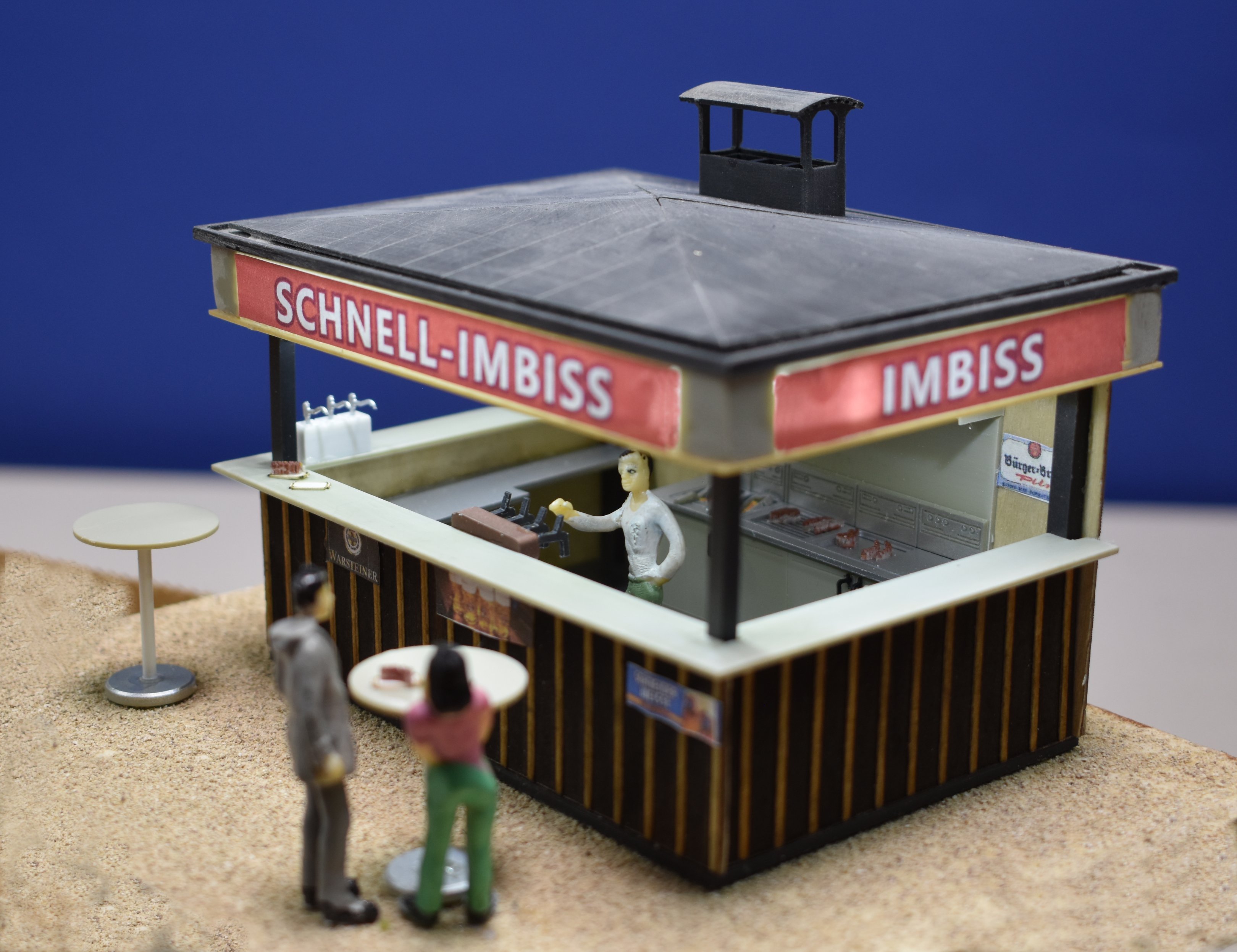 Der Bausatz enthält eine Bude mit verschiedenen Beschriftungsmöglichkeiten für die Werbefläche am Dachrand und weitere Plakate. Die Inneneinrichtung besteht aus einer umlaufenden Thekenanlage mit Schankbalken und Gläserspülbecken, Grillrost und Bratfläche. Ebenfalls sind Soßenschalen, Fritierkörbe, Ketschup- und Majospender sowie diverses Grillgut vorhanden.