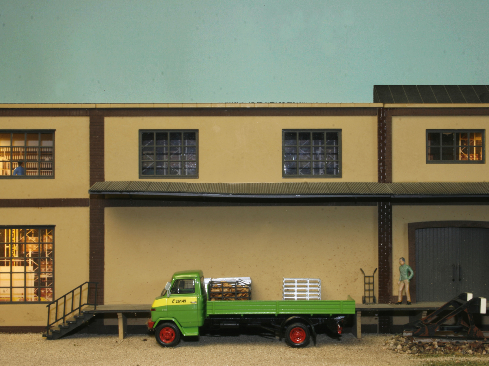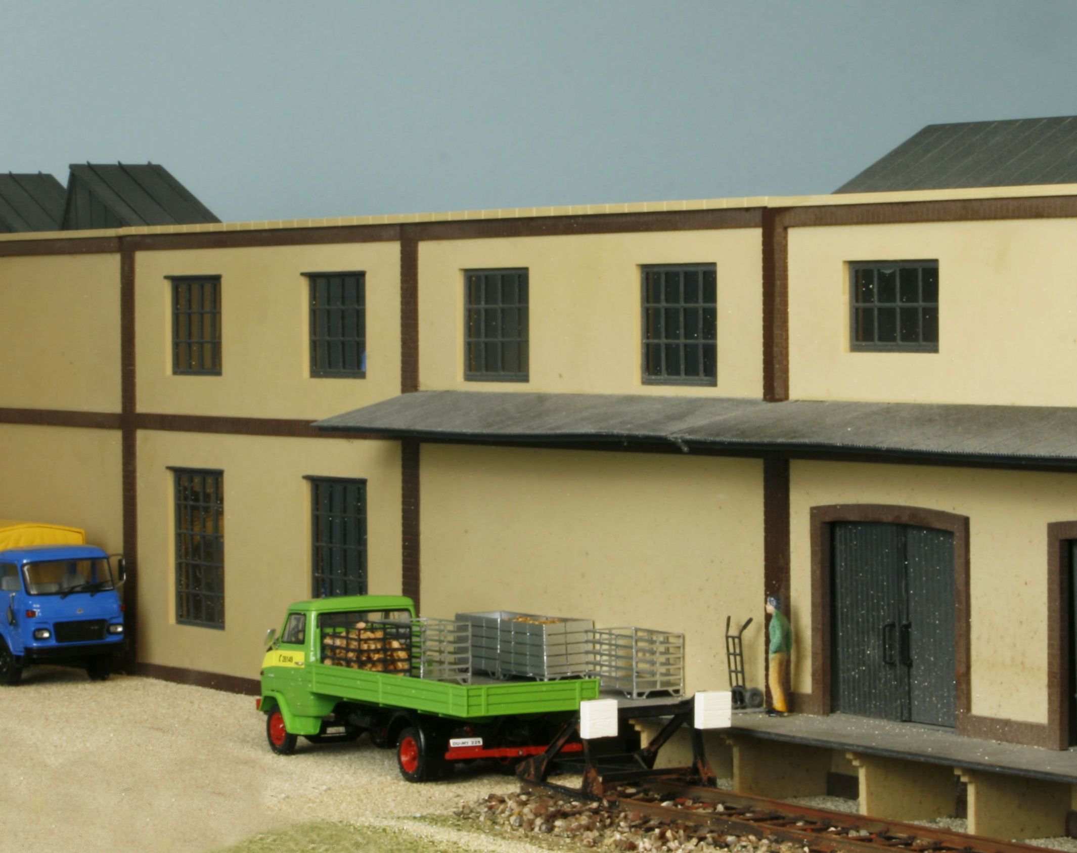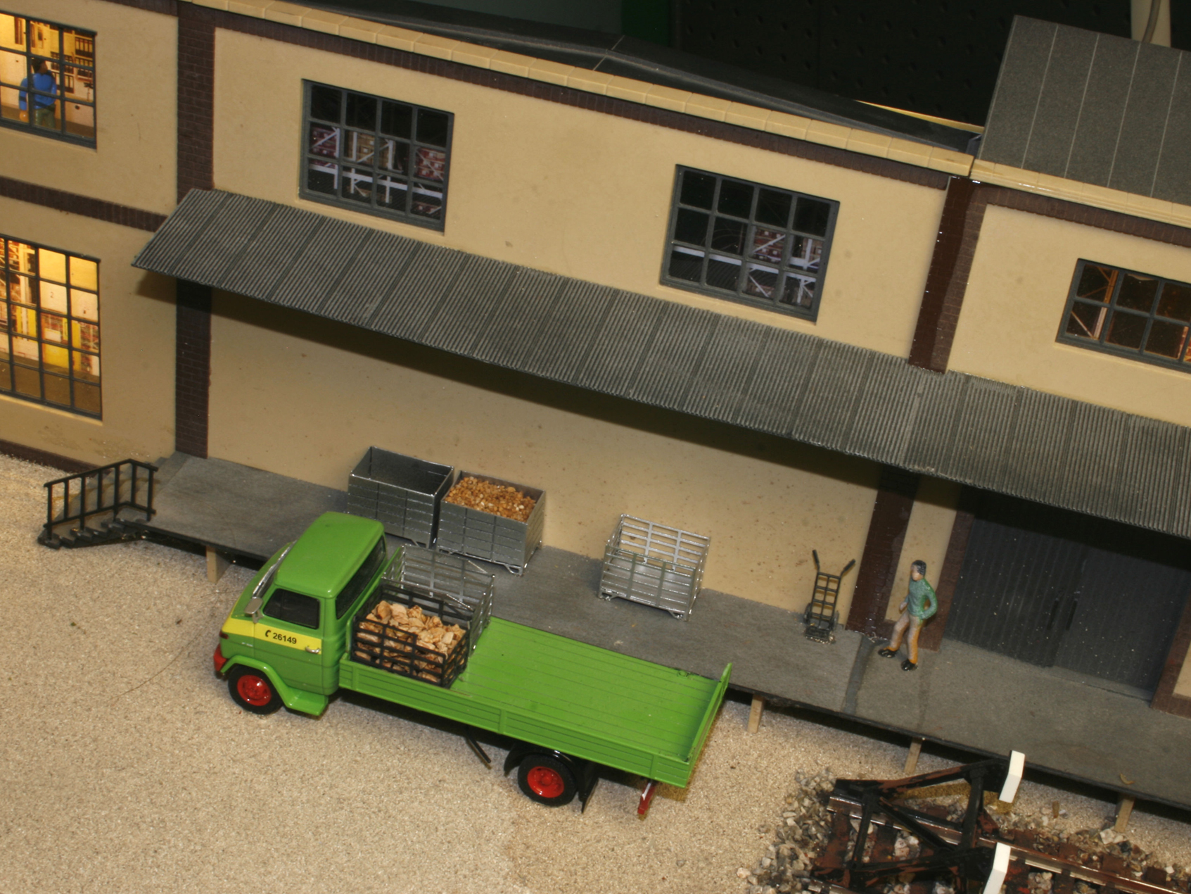Laderampe mit Vordach in Modulbauweise, dient zur Verlängerung des Moduls 33 360 (Modul mit Rampe) und als Erweiterung des Moduls 33 357 (Fabrikwand mit 2 Fenstern). Bausatz besteht aus einer vorgelagerten Laderampe (t = 60 mm) und einem Vordach (t = 59 mm). Auch die Ergänzung bereits bestehender Gebäude ist möglich.