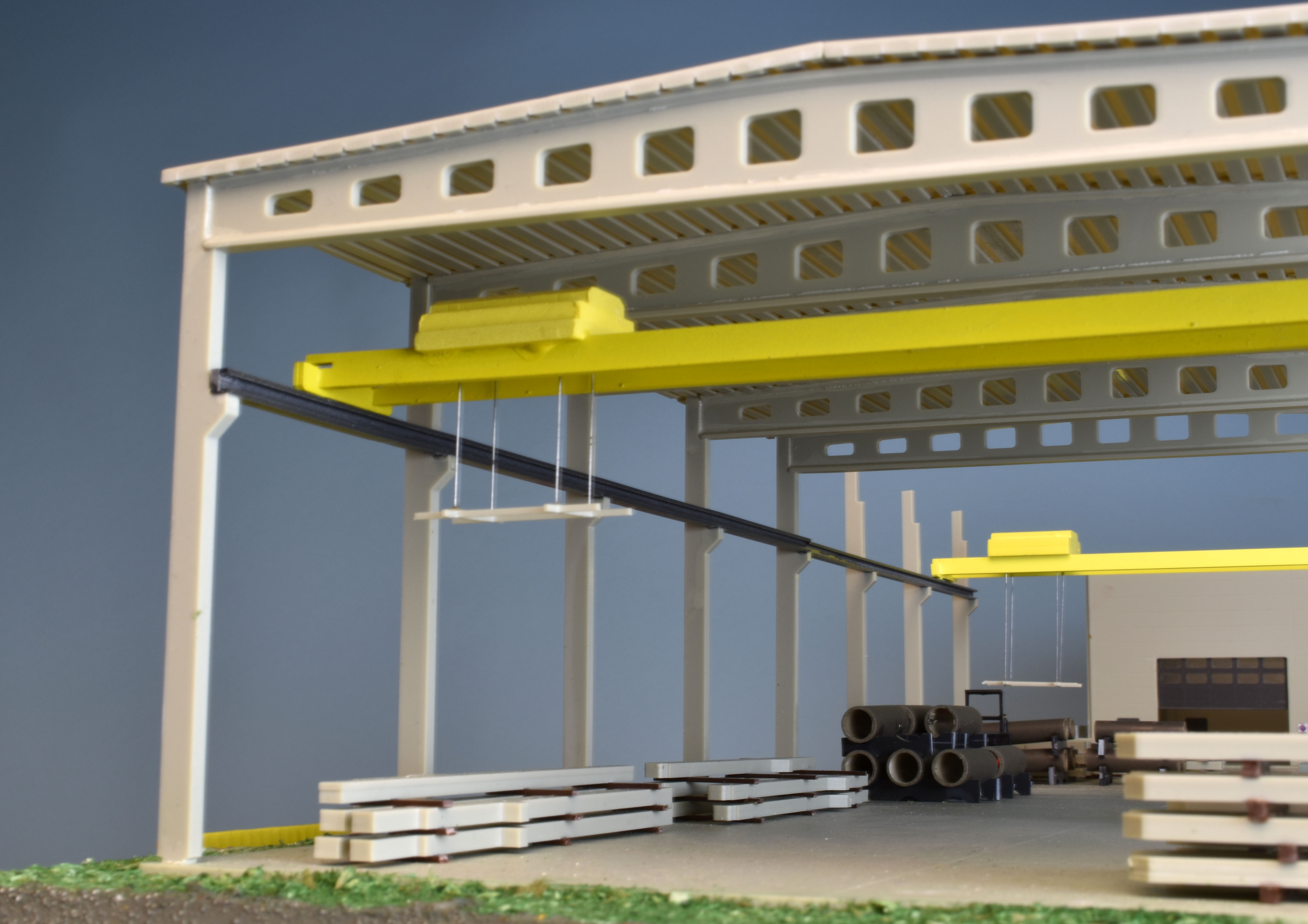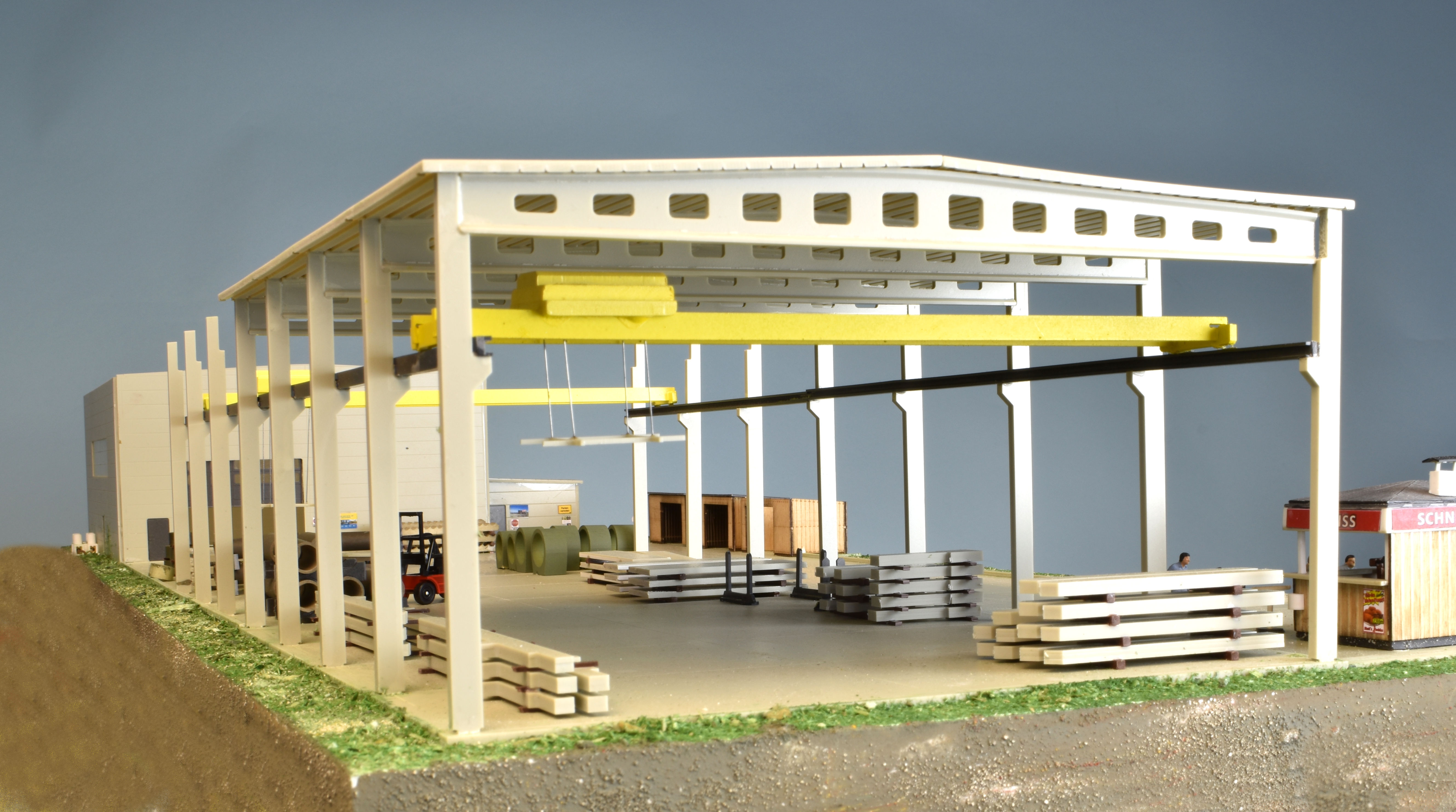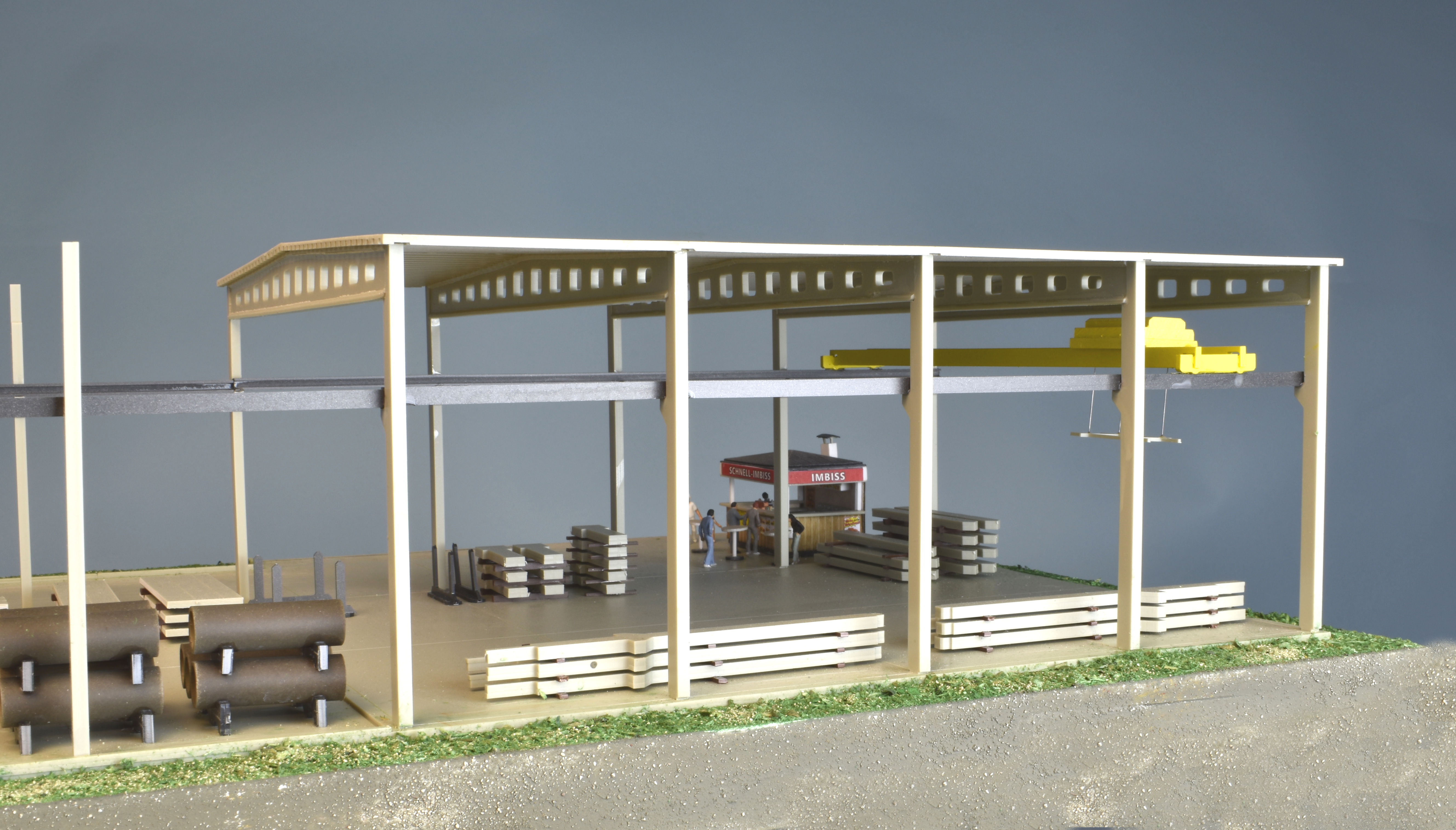 Alle Teile sind cnc-gefräst aus durchgefärbtem Polystyrol. Dach, Fassade, Stützen und Boden sind betongrau, Stahlträger und Laufkatze in antrazith, schwarz, weiß und beige.