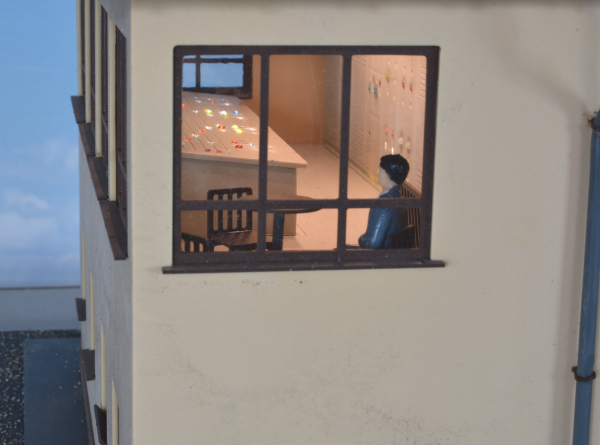 Im Bausatz enthalten der Treppenabgang, ein mit Leds beleuchtetes Stellpult sowie der hinterleuchter Schaltschrank bilden die Inneneinrichtung, ergänzt mit einem Tisch und 3 Stühlen.